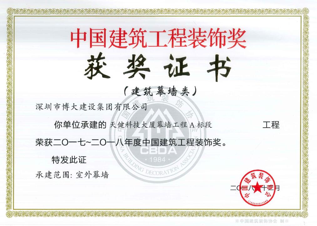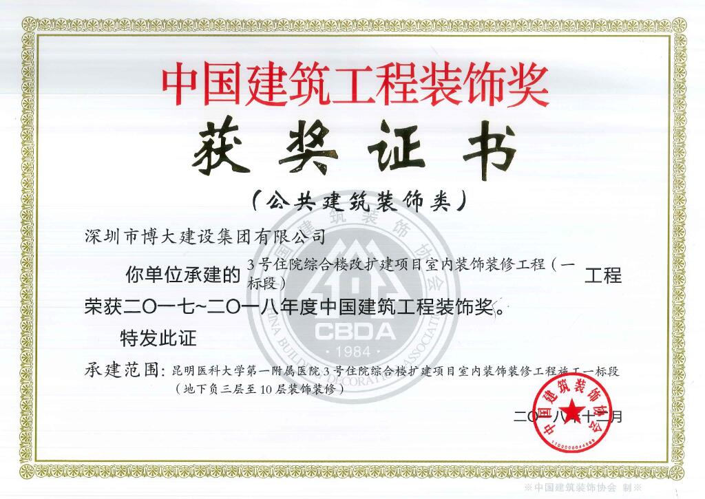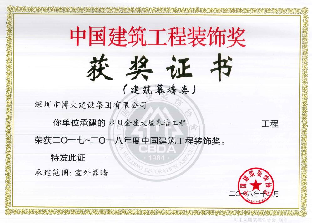 博大建設集團承建的昆明醫(yī)科大學第一附屬醫(yī)院3號樓、華遠金外灘四期君悅酒店、綠景虹灣裙樓商業(yè)公共部分、水貝金座大廈幕墻工程、天健科技大廈幕墻工程等5個經(jīng)典工程以卓越品質榮獲中國建筑工程裝飾獎。