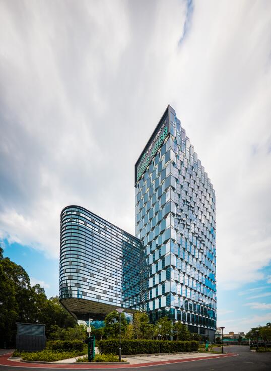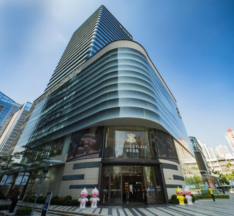 水貝金座大廈幕墻玻璃采用綜合性能較高的LOW-E中空玻璃; 3D打印彩釉,用內部燈光營造出絲綢的皺褶效果。玻璃、陶土板等面板,95%以上是在工廠加工,大大節(jié)省了現(xiàn)場施工時間,保障了工程的順利完工。