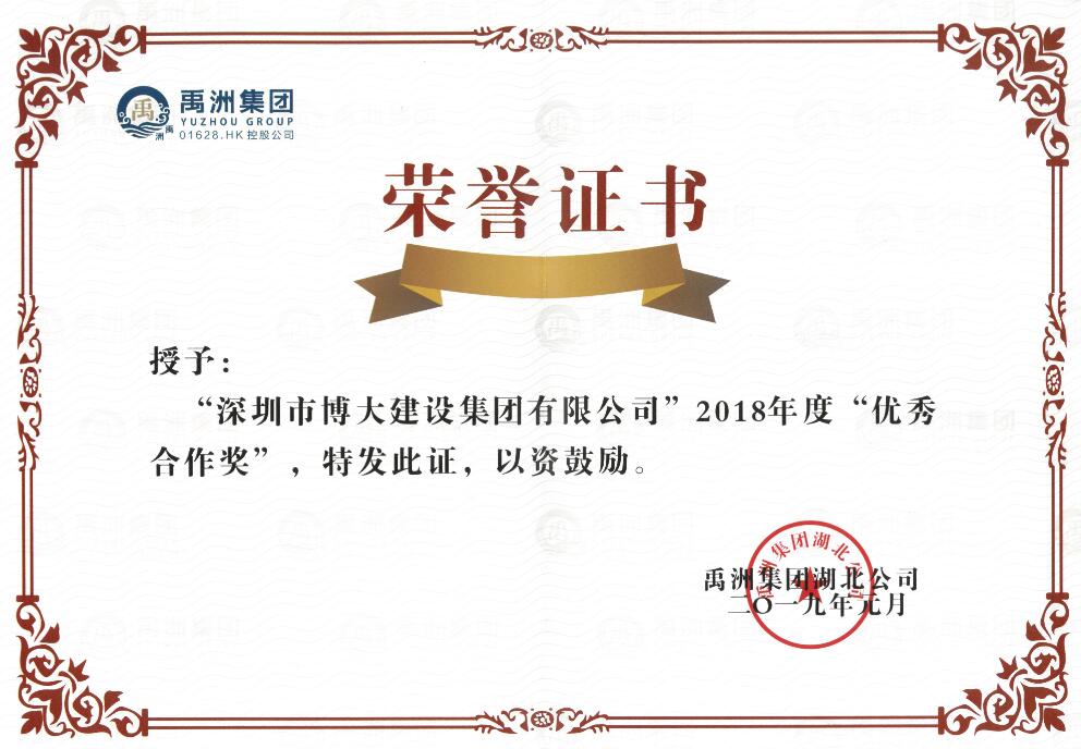 博大建設(shè)集團(tuán)承建了禹洲集團(tuán)湖北公司武漢賽洛城六期的精裝房工程,在武漢百盤(pán)維權(quán)的背景下,博大負(fù)責(zé)的精裝房一次性交房率達(dá)到98.41%,且工程質(zhì)量?jī)?yōu)秀,幫助客戶(hù)成功避免了因交期、裝修質(zhì)量而造成的消費(fèi)者維權(quán)風(fēng)波。博大的綜合實(shí)力和用心服務(wù)贏得禹洲集團(tuán)湖北公司的高度認(rèn)可,榮獲2018年度優(yōu)秀合作獎(jiǎng)。