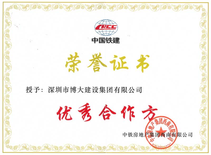 博大建設集團作為中國鐵建的長期合作伙伴,已連續(xù)數(shù)年榮獲“優(yōu)秀合作方”稱號。