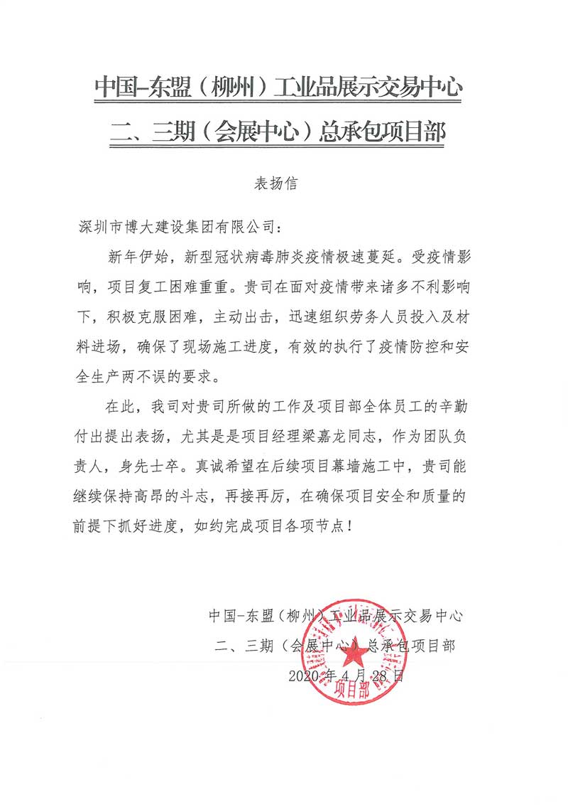 博大建設集團在中國-東盟(柳州)工業(yè)品展示交易中心二、三期(會展中心)項目中,積極克服疫情造成的困難,主動出擊,確保了現(xiàn)場施工進度,有效的執(zhí)行了疫情防控和安全生產(chǎn)兩不誤的要求,獲得客戶表揚。