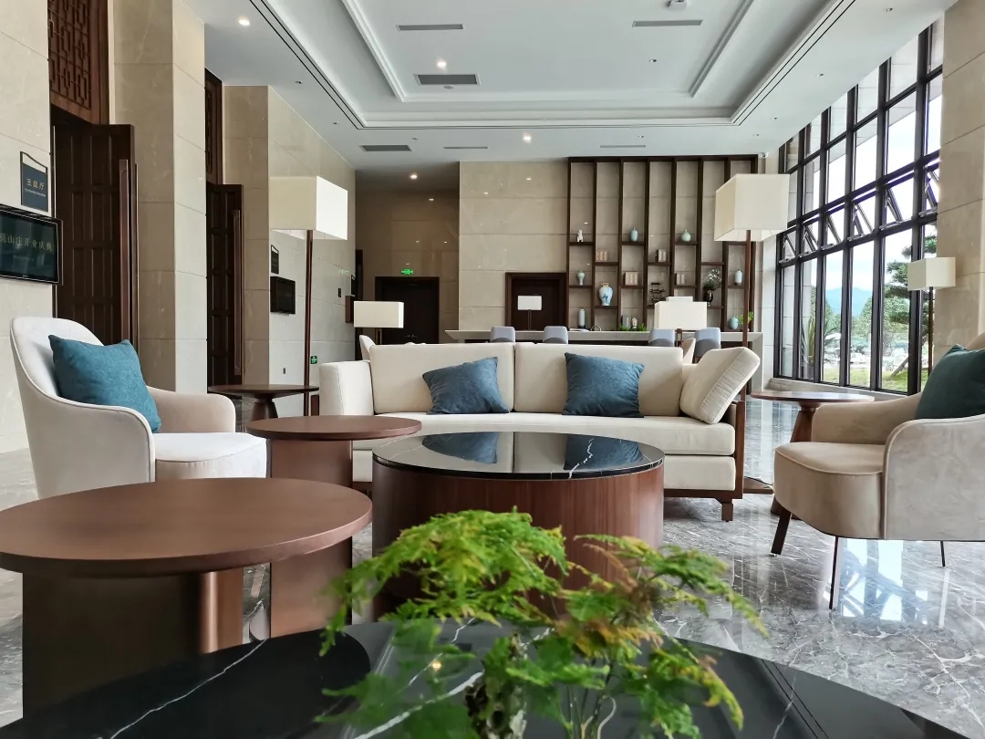貴州山水特色“小時(shí)不識(shí)月,呼作白玉盤(pán)”,盤(pán)州月亮山莊酒店以“月”為主題,處處彰顯“月”的文化元素,“滿(mǎn)月”的石材造型屏風(fēng),用米黃色大理石干掛制作而成,表現(xiàn)“月”的圓滿(mǎn),溫潤(rùn),也需要對(duì)石材獨(dú)具匠心的制作工藝。