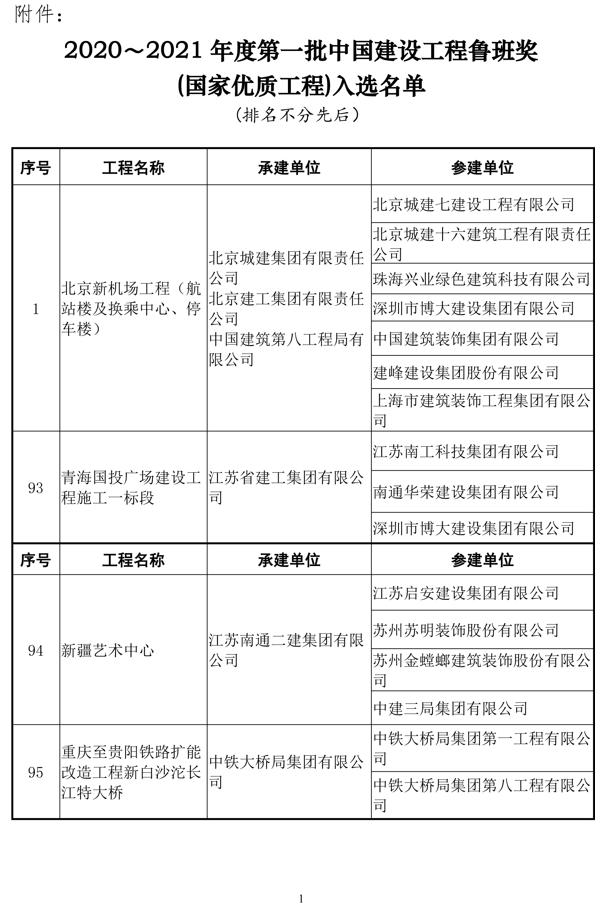 11月30日,根據(jù)中國建筑業(yè)協(xié)會(huì)的公示文件,2020~2021年度第一批中國建設(shè)工程魯班獎(jiǎng)(國家優(yōu)質(zhì)工程)申報(bào)、復(fù)查、評(píng)審、審定工作已結(jié)束,博大建設(shè)集團(tuán)參建的北京大興國際機(jī)場(chǎng)、青海國投廣場(chǎng)兩個(gè)項(xiàng)目榮獲國家建筑行業(yè)工程質(zhì)量最高榮譽(yù)——中國建設(shè)工程魯班獎(jiǎng)(國家優(yōu)質(zhì)工程)。