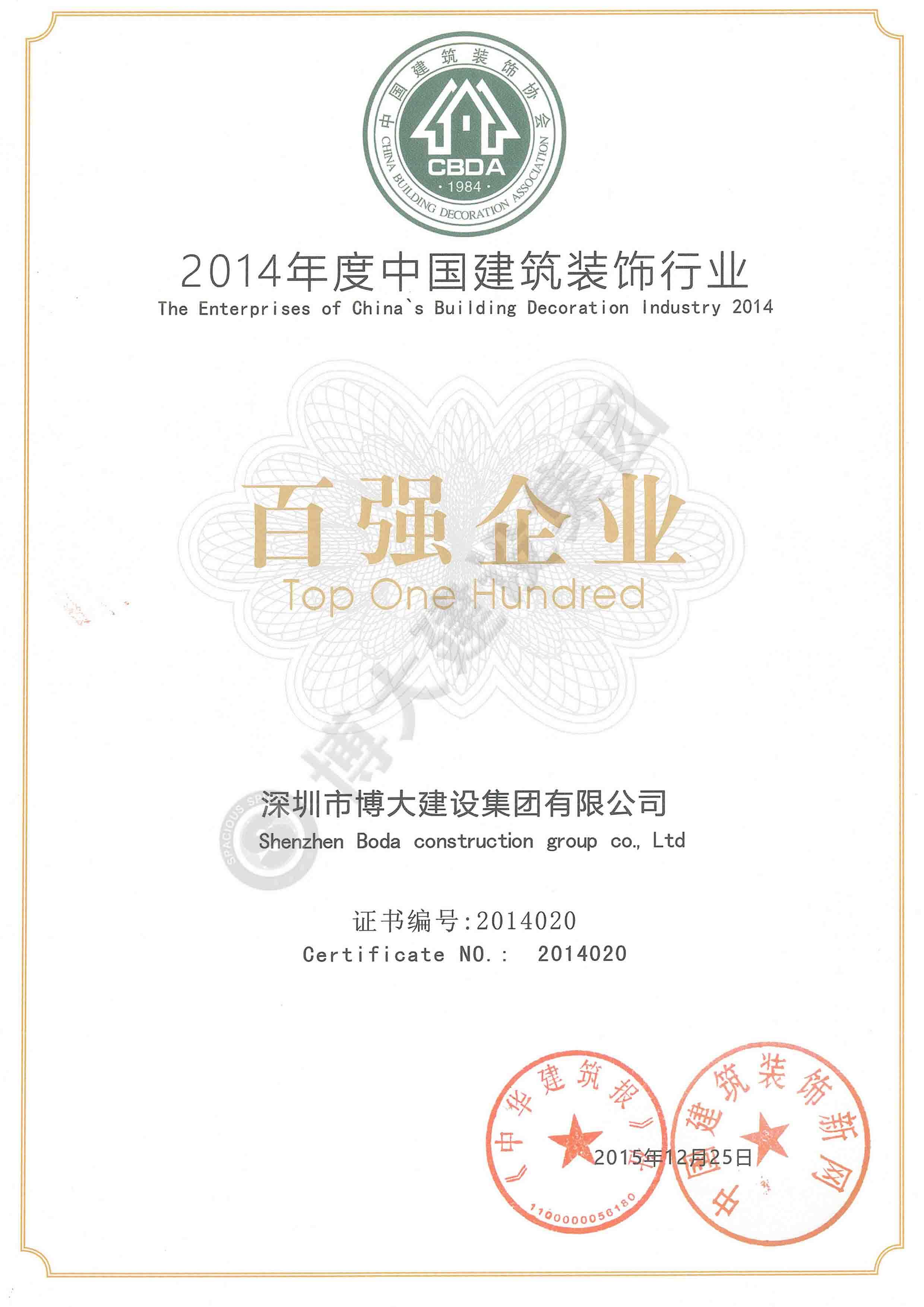 2014年度中國建筑裝飾百強(qiáng)企業(yè)