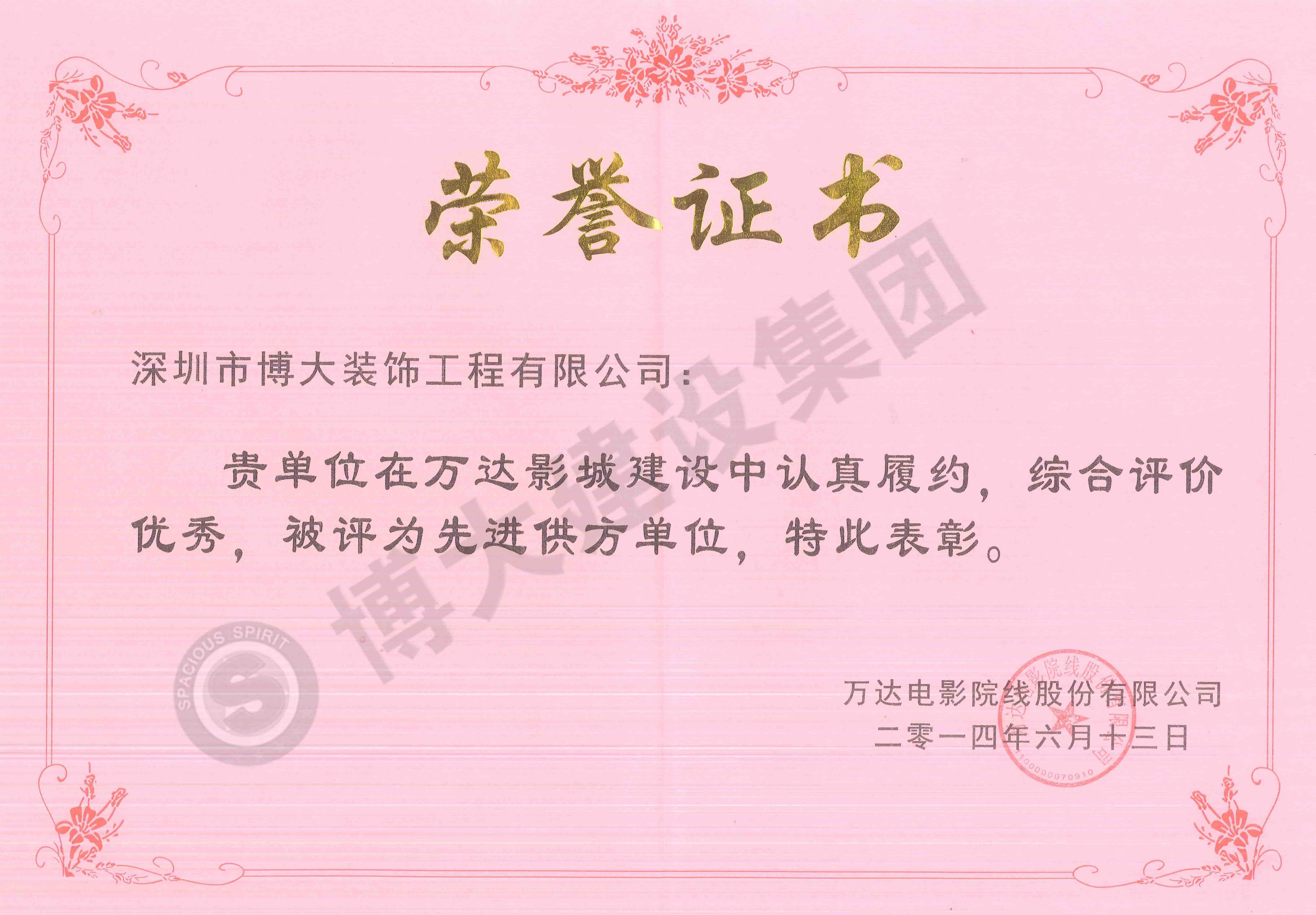 榮獲萬達(dá)影城先進(jìn)供方單位
