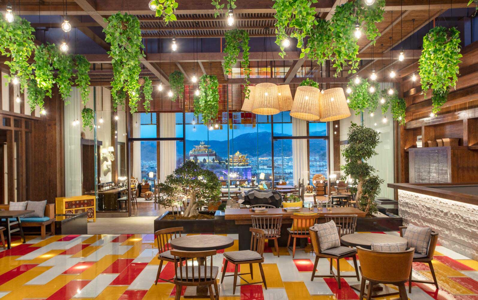 酒店大堂大氣而不失現(xiàn)代藝術(shù)美感,走進(jìn)其間,隨處可見(jiàn)極具當(dāng)?shù)仫L(fēng)格的藝術(shù)品與裝飾,隱約可見(jiàn)香巴拉的縮影。頂部設(shè)計(jì)對(duì)光影的巧妙運(yùn)用可謂巧奪天工,自然光線透過(guò)鏤空屋頂灑落下來(lái),與地面交相輝映,且在高原寒冷地區(qū)用特色小景、綠植裝點(diǎn),讓人如同置身熱帶溫室,光影交錯(cuò)間,營(yíng)造出“眼有星河,心藏日月”的詩(shī)意畫(huà)面。
