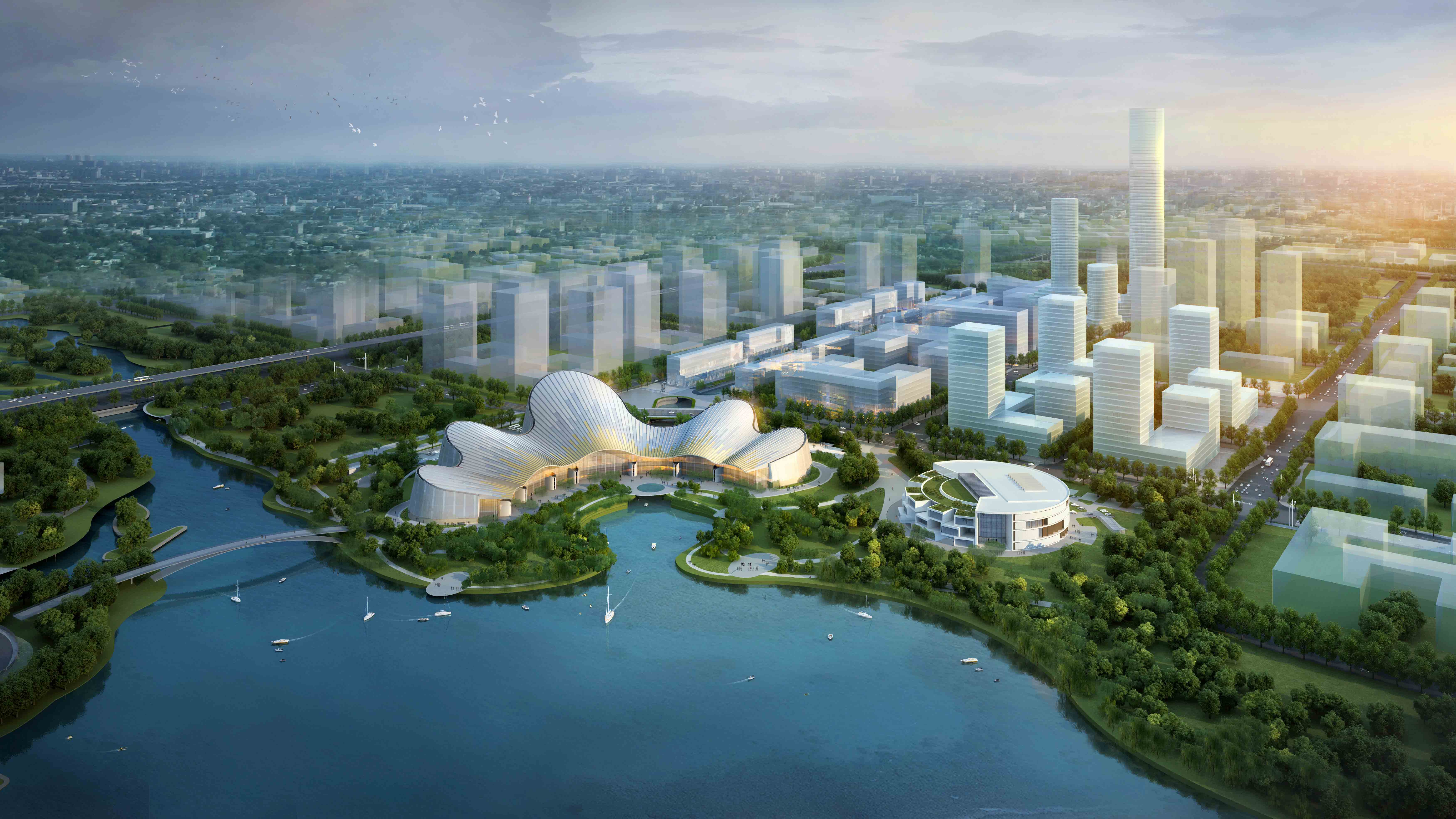 城市一側(cè),有著柔和曲線,潔白的舞臺(tái)塔,仿佛是一片輕盈的祥云,駐足在紫瑯湖畔,引導(dǎo)著行人來(lái)到湖邊,向他們展示優(yōu)美動(dòng)人的湖岸景觀。