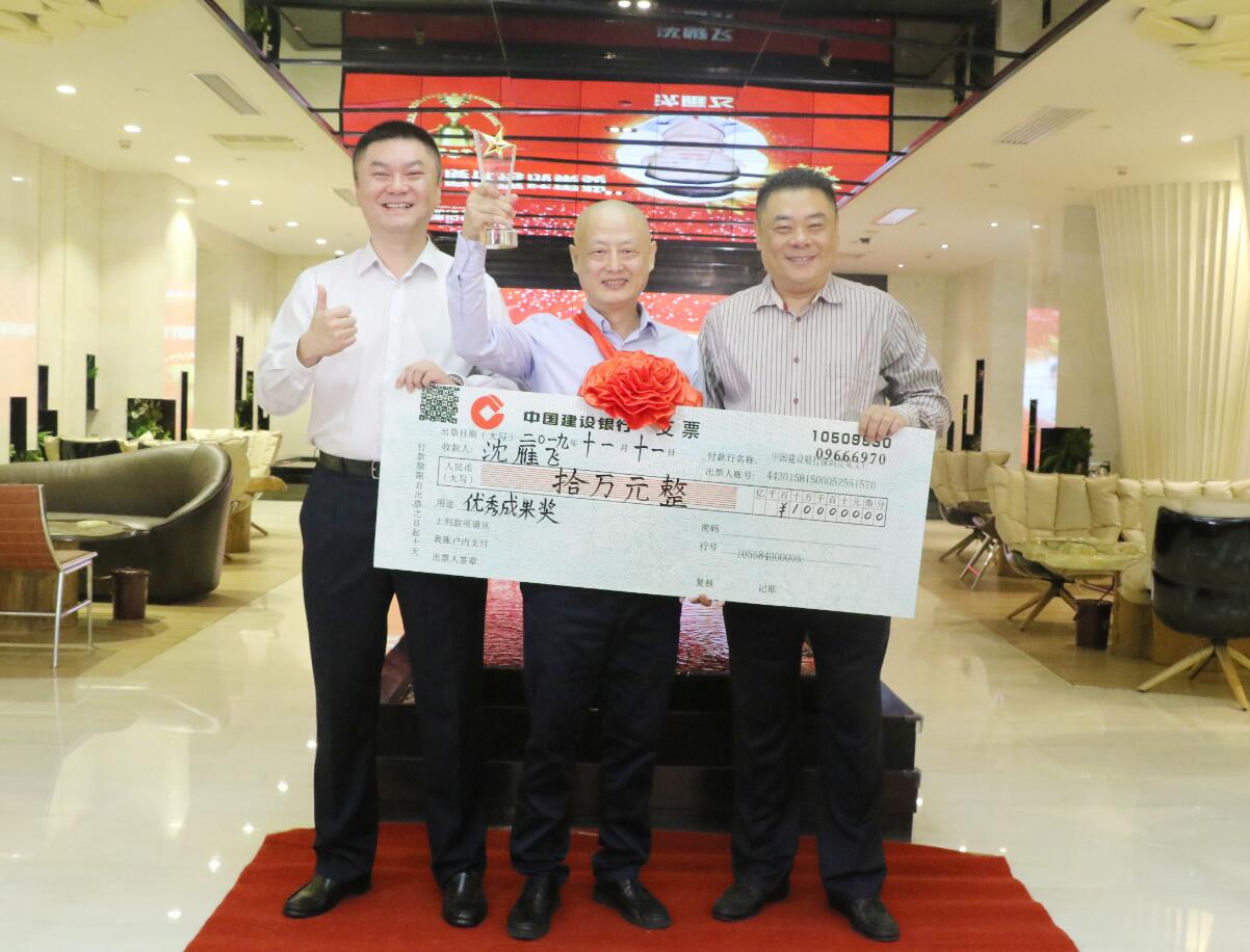 集團(tuán)常務(wù)副總裁沈雁飛在集團(tuán)業(yè)務(wù)拓展中做出突出貢獻(xiàn),被授予優(yōu)秀成果獎(jiǎng),獎(jiǎng)勵(lì)10萬(wàn)元。圖為徐凱宏董事長(zhǎng)、黃河副董事長(zhǎng)與獲獎(jiǎng)?wù)吆嫌傲裟睢?br />
