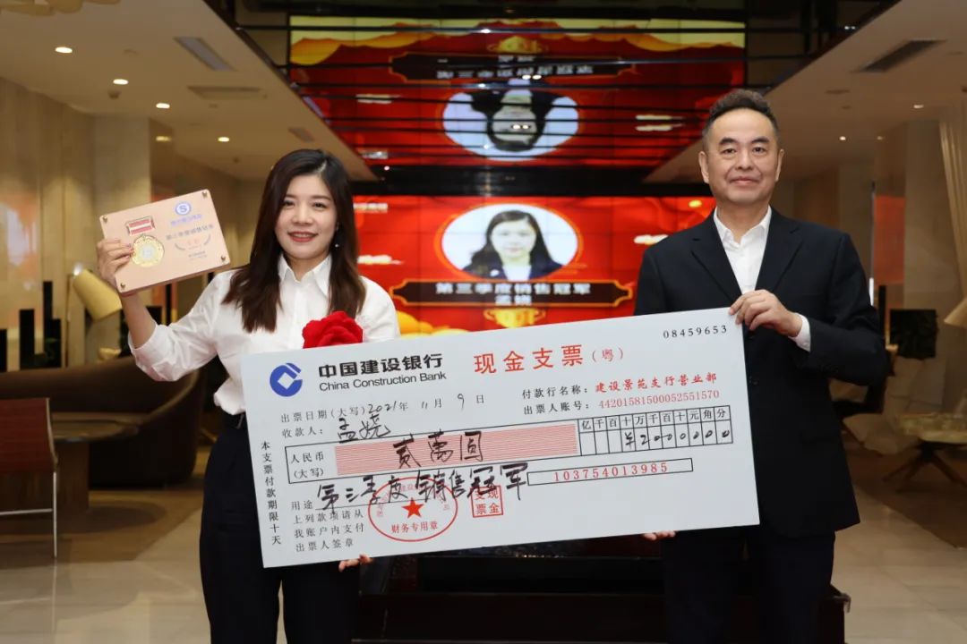 圖 | 董事長(zhǎng)洪宇為孟嬈頒發(fā)第三季度銷(xiāo)售冠軍獎(jiǎng)