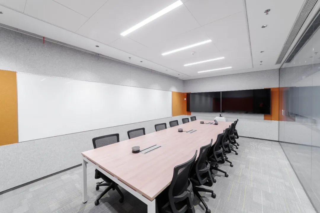 天花采用鋁方通格柵吊頂和開(kāi)放式原頂噴涂,增加了平面導(dǎo)向性,提升了天花空間,降低了多種裝飾材料堆積造成的空氣污染,營(yíng)造綠色環(huán)保的辦公環(huán)境。
